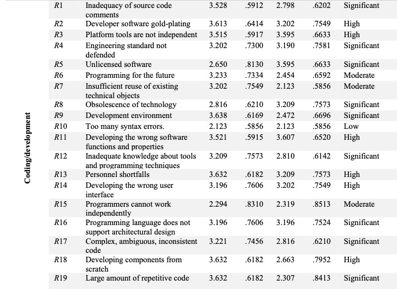 In a risk management strategy, the priority is therefore to be able to characterize the events likely to emerge during the life cycle of the project and capable of disrupting its smooth running. In a field relatively close to ours, Bilal et al. (2020) declined all the possible risks during the different phases of the software development project. The authors characterized 83 risk factors throughout the lifecycle of a project (see below for an excerpt of 19 risk factors for the coding / development phase). In addition to this census work, the authors also showed the criticality of each risk factor by calculating their probability of emergence and their impact on the progress of the project in the event of a confirmed risk. The proximity of the field of study to our field of digital IT solution development leads us to draw inspiration from this systematic characterization strategy by adapting the risk factors to our specificity.