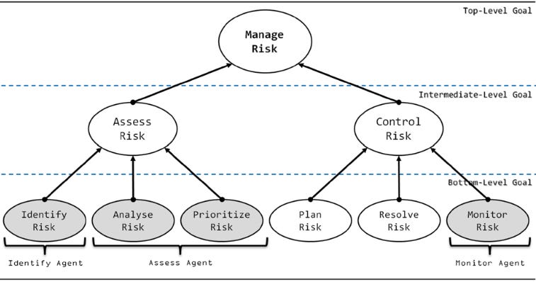 The authors show, through this breakdown of risk management, that a priori intelligent agents (in gray) can be implemented for the phases of risk identification, risk analysis, risk prioritization and risk monitoring. The results of the study show that the use of intelligent agents capable of participating in these phases of the risk management strategy considerably reduce (50%) the human efforts associated with manual risk management.